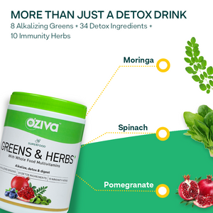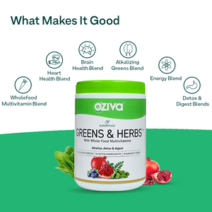 OZiva Superfood Greens & Herbs is India’s First Blend of 35+ Superfoods, Greens and Ayurvedic Herbs. It is a Plant based Herbal drink which improves Digestion, Detoxifies the body, boosts Brain & Heart health, increases Energy and improves overall Immunity.