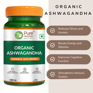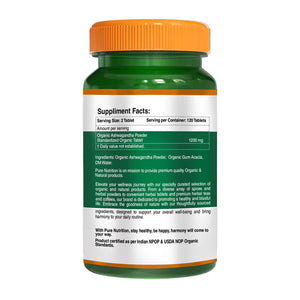 Pure Nutrition Organic Ashwagandha Supplement is designed to harness the power of one of nature's most revered herbs. Known for its adaptogenic properties, Ashwagandha supports stress management, enhances sleep quality, promotes fertility, boosts immunity, and increases overall vitality and strength. This organic supplement is perfect for anyone looking to enhance their physical and mental well-being naturally.