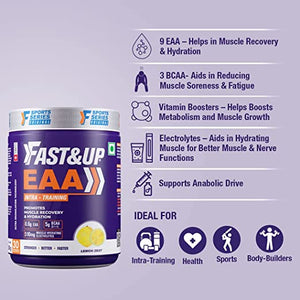 Fast&Up EAA is an advanced science-based formula designed with a complete spectrum of 9 essential amino acids with BCAAs, added Hydration and Vitamin Booster blend. EAA stands for essential amino acids which the body cannot produce on its own and should be obtained from diet and supplementation. There are total of 9 essential amino acids. 8.6 g of EAA blend present in Fast&Up EAA helps build, repair and refuel muscles for reduced muscle fatigue & soreness. This formula contains taurine, which aids in re-energizing and muscle healing, as well as citrulline, which helps oxygenate and eliminate toxins from muscles. BCAAs are the essential amino acids -leucine, isoleucine, and valine, which account for around 30-44 percent of muscle protein in the body. BCAAs are essential for muscle protein synthesis and recovery. They also assist to regulate muscular glycogen levels, which reduces and assures minimum protein breakdown during exercise. The hydration blend consists of essential electrolytes that are required by the body for proper nerve and muscle function. Electrolytes are required for normal muscle contractions and are considered to contribute to muscular fatigue. They help in tissue repairing as well as hydrating the body, balancing blood acidity and pressure. Fast&Up EAA also contains a goodness of Vitamin booster blend consisting of Vitamin B1, B2, B3, B6 and C. This blend helps in muscle growth and maintaining muscle health. This Vitamin blend will support performance and endurance while Vitamin C will help in boosting immune function and may help in repairing damaged tissues as a result of intense activity. Fast&Up EAA is a science-based formula designed with high quality ingredients, 100% vegetarian with no added sugar and caffeine. Fast&Up EAA is made with Ultra Granulation technology, available in refreshing and tasty Lemon Zest flavour and is banned substance free. This intra-training formula can be consumed with water or any other healthy recipe of your choice. Add one scoop to 250 ml of water, Mix well and Drink during trainings to attain peak performance.