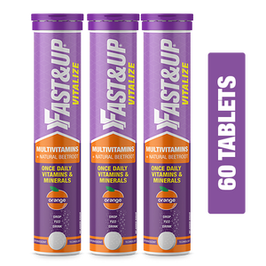 Fast&Up Vitalize Pack of 3 tubes comprise of unique multivitamins effervescent tablets in orange flavor is important for every day health. Fast&Up Vitalize multi-vitamins helps in maintaining the daily fitness goals of the body and overall well-being as they comprise of 12 vitamins, 9 minerals along with proprietary nitrate rich beetroot extract with 7% natural nitrate content. The effervescent tablets with vitamins, minerals and phytonutrients are easy to absorb and gentle on digestive track giving maximum health benefit. The beetroot extract improves the circulation thereby adding to heart health for athletes. This helps performance building owing to a robust circulatory system that provides energy boost to the body. Vitalize Multi-vitamins helps to boost immunity making the body more durable to infections as well. The antioxidant property of Vitamin C helps in accelerated repair of wounds and healthy connective tissues. Vitalize effervescent multivitamin tablets also contains Magnesium and Calcium and vitamins such as Vitamin K and Vitamin D3 which aid in maintaining bone health. Vitamin B1, B2 and B6 are important for healthy brain functioning as well reducing anxiety and depression. Fast&Up Vitalize is a multivitamin drink which is easy to consume as each tablet is to be consumed by dissolving it in 250 ml of water. Fast&Up Multi-Vitamins is a one stop solution for obtaining ideal health boosting nutrients instead of depending on multiple tablets for a healthy and active lifestyle.