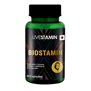 Biostamin is an innovative nutritional supplement in the form of capsules specially designed to cater to the needs of an individual, having hair and skin problems. Biostamin capsules are an excellent combination of Biotin with L-Tyrosine, Vitamin C, Selenium and Zinc along with Iron, Folic acid and Vitamin B12. It is a unisex product, suitable for both men and women The combination of nutrients present in appropriate amounts e?ectively aids in the management of hair loss supports hair growth and healthy skin It contains 10mg of biotin, a water-soluble vitamin that plays an important role in the growth and maintenance of hair, skin, and nails. It helps in the synthesis of fatty acids, proteins, and metabolism of amino acids
