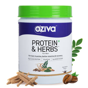OZiva Protein & Herbs packs 23 g of Cold Processed & Ultrafiltered Whey Protein with 5.5 g of BCAAs and Ayurvedic Herbs like Ashwagandha, Chlorella, Wheatgrass, Maca, Musli, Brahmi, Moringa for Better Stamina, Recovery & Lean Muscles.