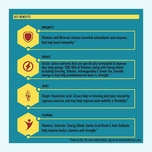 Vitamins, minerals, Tribulus, Ginseng & Ashwagandha help provide enzymes to the body, leading to improving energy metabolism, so that you always stay on top of your game.