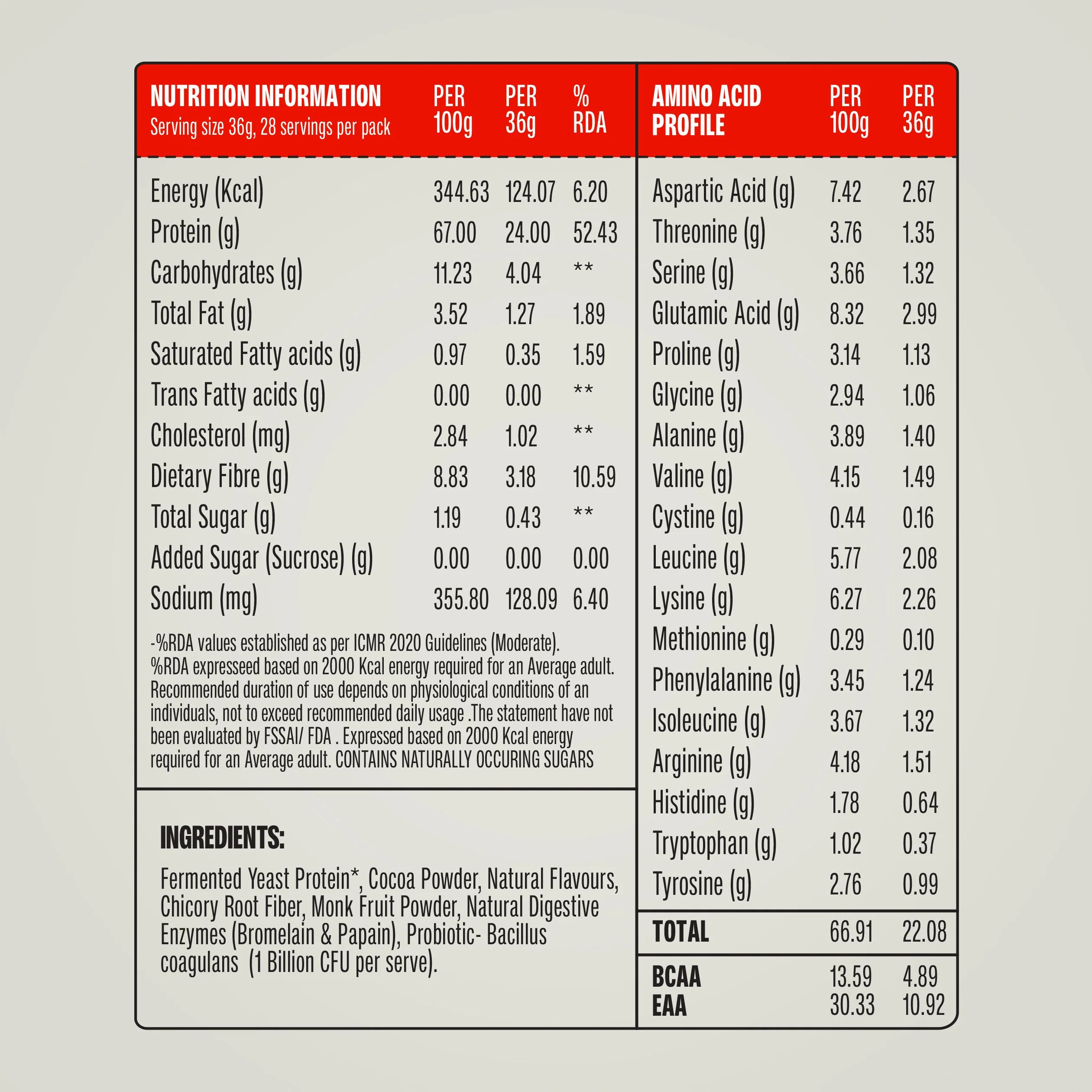 sugar , dairy or chalkiness. Each scoop is packed with 24g of gut loving protein that keeps you feeling light. Made with bio-fermented yeast protein for easy digestion and real muscle support.