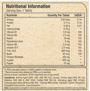 Pure Nutrition Vitamin B Complex, as the name suggests, contains essential B vitamins such as vitamin B1, B2, B6, B12, niacin, pantothenic acid, folic acid, biotin, choline bitartrate, papain, and inositol. It helps maintain energy levels, supports brain functions, and ensures smooth functioning of the nervous system. Vitamin B also helps to regulate our metabolism. It plays an essential role in converting all carbs into glucose which then is converted into energy. It is very important to make sure that our body is properly fueled to perform daily activities and our energy levels don't fall. Pure Nutrition Vitamin B complex supplement is meant for this role. Folate, a form of Vitamin B, converts carbohydrates into energy. Vitamin B12 helps keep blood cells healthy. Since inner health often appears on your face and skin, Biotin helps promote skin, hair and nail health. Inadequate levels of B complex vitamins in the body could lead to compromised physical performance. Pure Nutrition B complex vitamins improve the body's energy levels that may help overcome loss of efficiency during normal work.