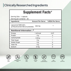 Miduty Liposomal NMN 85% - β-NMN is formulated with 85% high-purity β-Nicotinamide Mononucleotide (β-NMN) —a direct precursor to NAD+ (Nicotinamide Adenine Dinucleotide), a vital coenzyme involved in energy metabolism and cellular health.