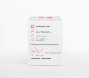 The marine collagen peptides in each sachet of Nutrova Collagen+Antioxidants are of a specific size that our digestive system can directly absorb (di- and tri-peptides, average molecular weight 3000 Da). Once absorbed, these peptides are directly used by our body to build new collagen in our skin and repair damage.