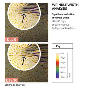 Day 30 Results: Improved skin texture, elasticity and firmness. Reduced wrinkle width and dark spots.