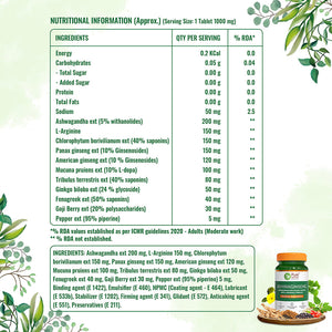 Chlorophytum borivilianum (SafedMusli), L-Arginine, Mucuna pruriens, Tribullus terrestris, Asparagus Racemosus, Ginkgo , Ashwagandha , Ginseng etc.