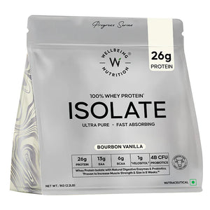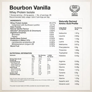 Introducing India’s first Whey protein isolate with Velositol®clinically proven to improve muscle strength & endurance in 8 weeks. Our ultra-pure, non-denatured Whey protein powder delivers 26g protein, 13g EAA, & 6g BCAA with 4 Billion CFU of probiotics & digestive enzymes for a gut-friendly dose of goodness without any bloating. Sweetened with zero-calorie monk fruit, our decadent Bourbon Vanilla flavoured whey protein supplement is instantized for a smooth, light texture—perfect for fueling workouts, recovery, and daily nutrition.